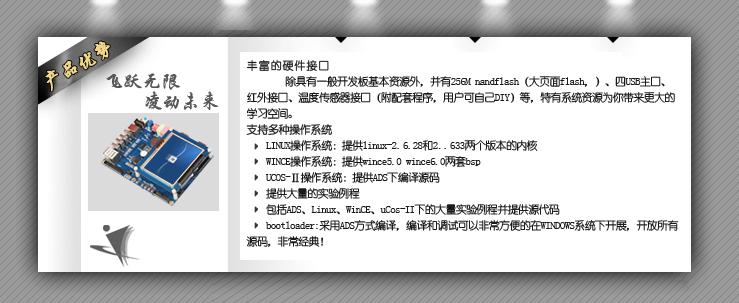 - 備注:獨有的硬件選擇啟動系統方案:開發板為Linux和Wince雙系統,可直接通過撥碼開關進行硬件選擇啟動的操作系統。這樣操作更加方便,也可使初學者朋友深入掌握硬件切換操作系統的方法。